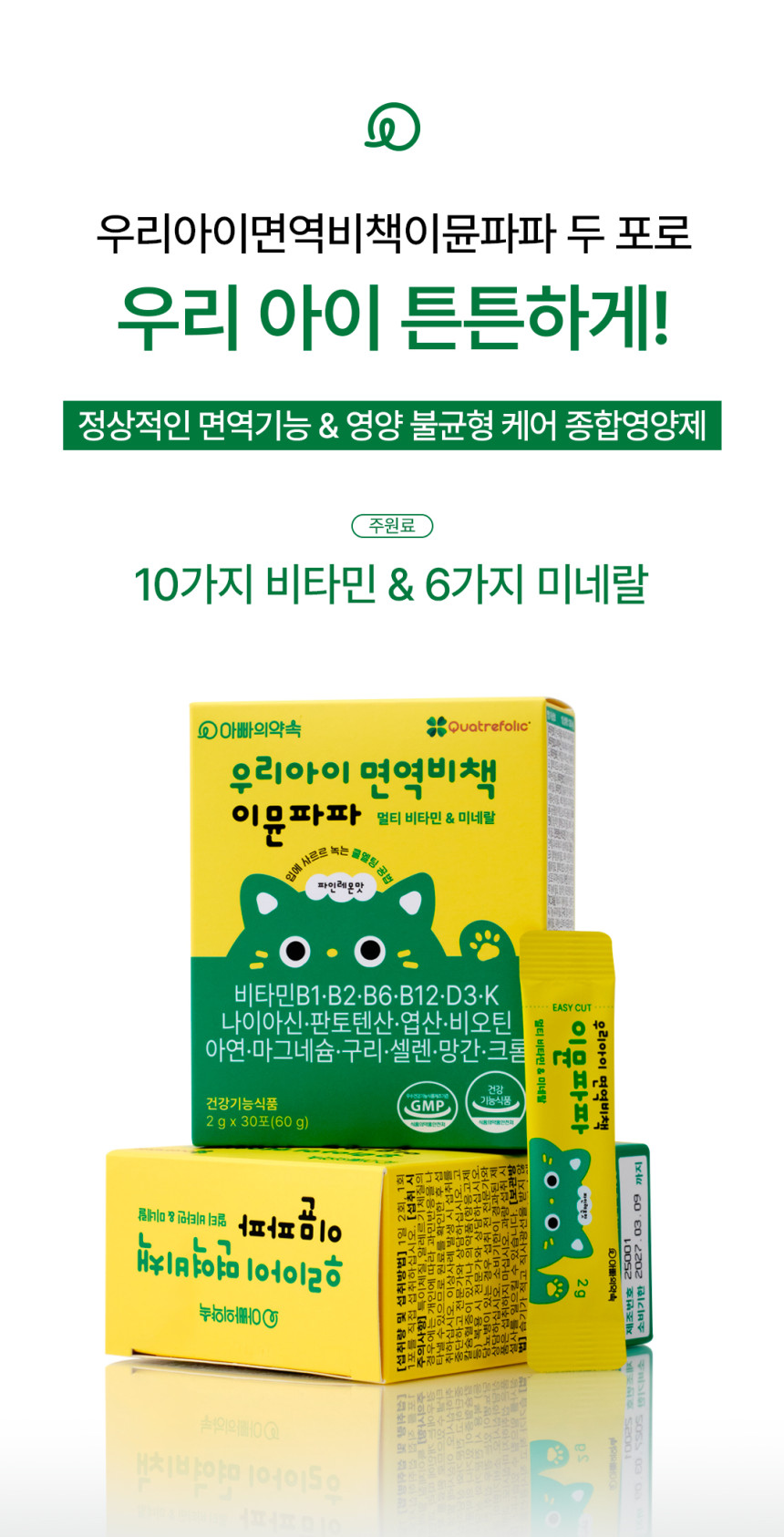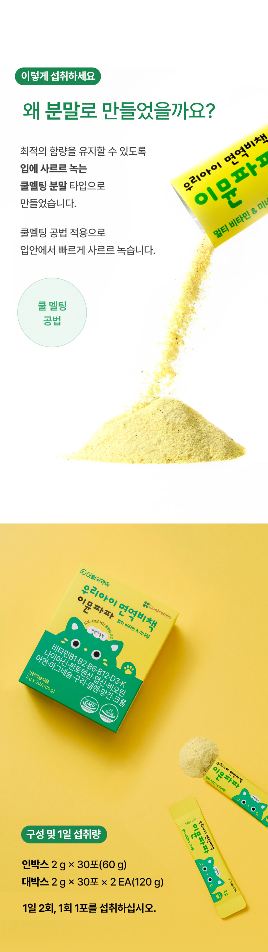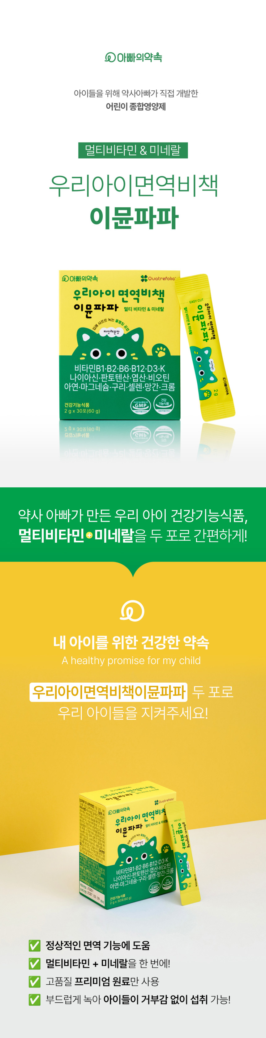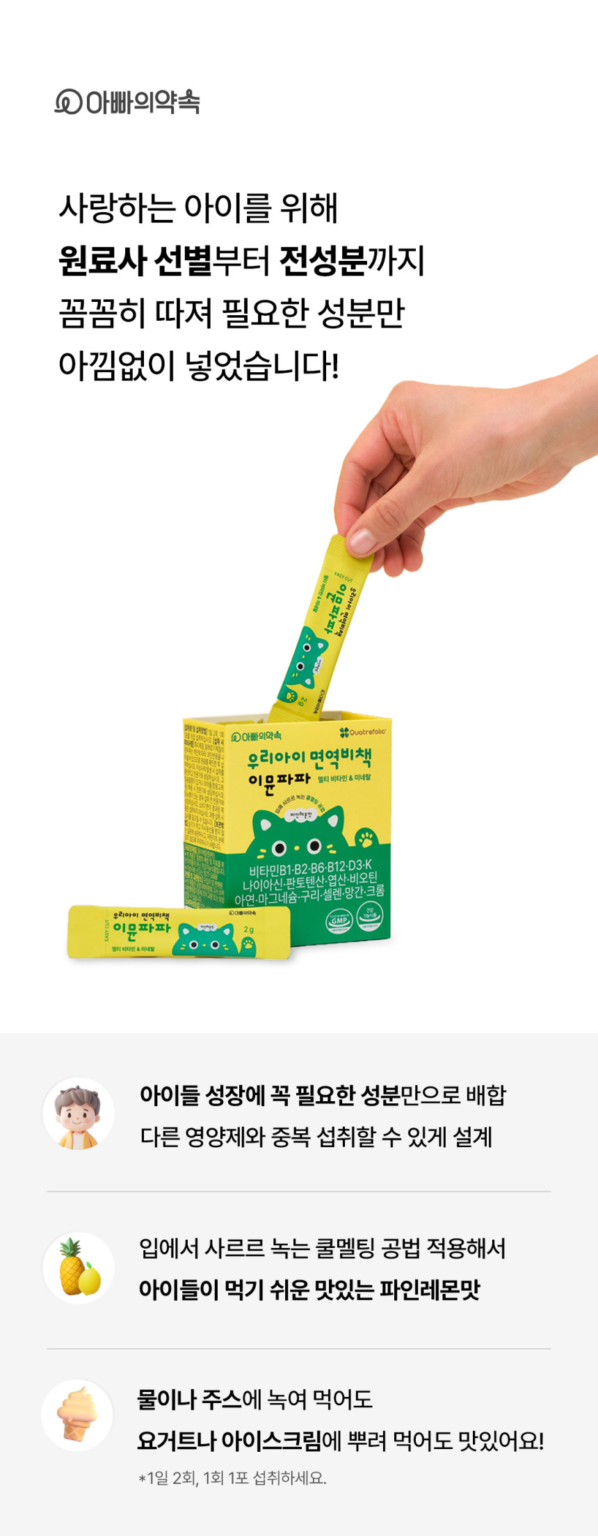 - "9가지 미네랄과 12가지 비타민을 한포에 간편히 섭취로 아이들의 면역과 염증제거 해결