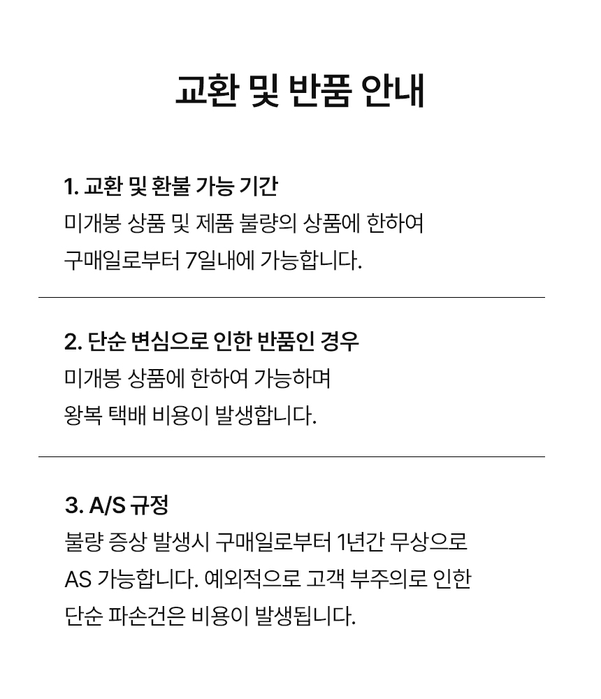 - 단순 변심: 구매일 기준 14일 이내 (왕복 배송비 고객 부담)