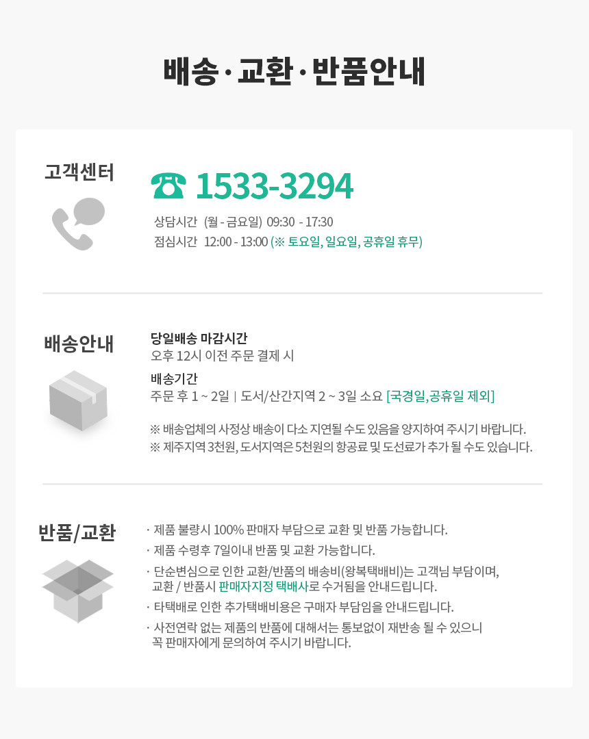 ※ 고객님의 마음이 바뀌어 교환, 반품을 하실 경우 상품반송 비용은 고객님께서 부담하셔야 합니다.