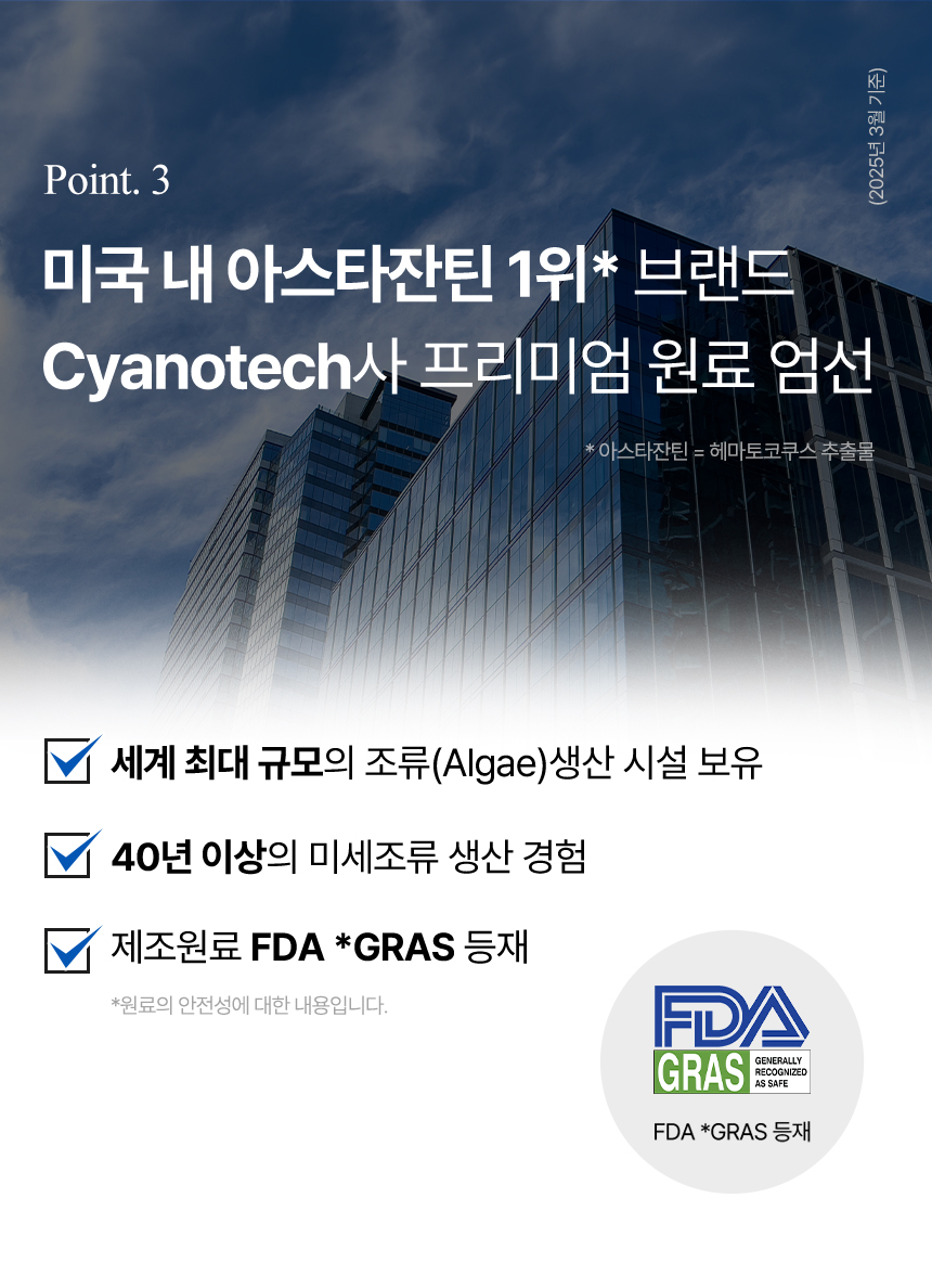 - 세계 최대 조류 시설에서 40년 전문성으로 완성된 Cyanotech사 아스타잔틴